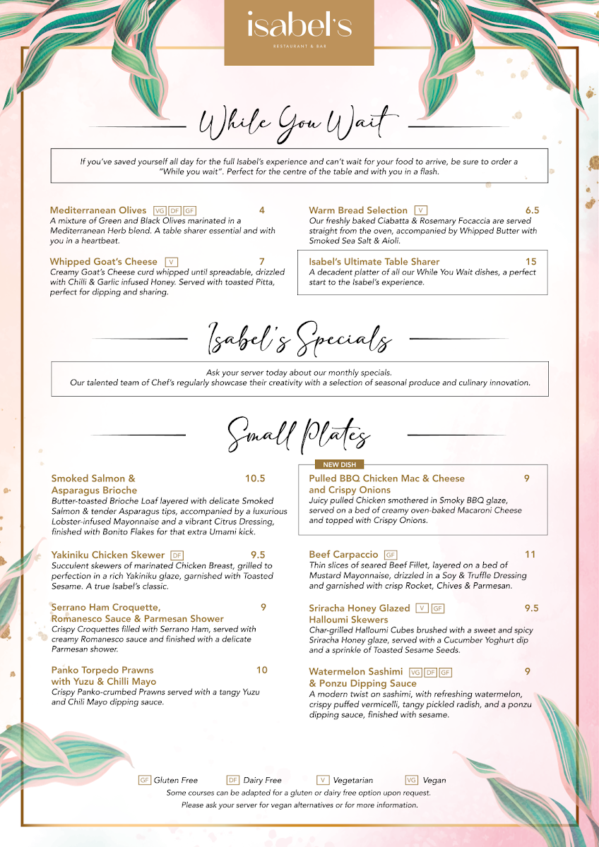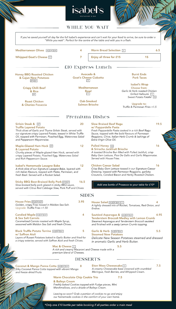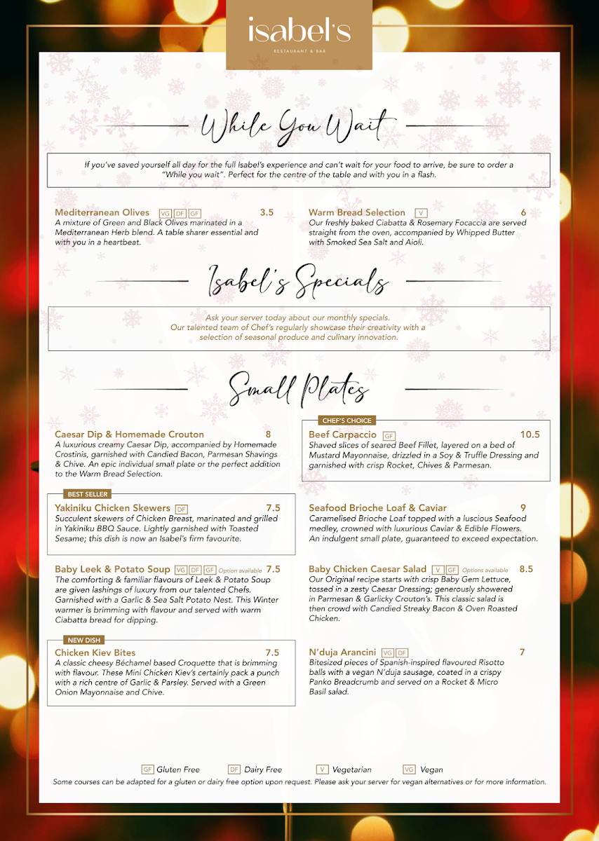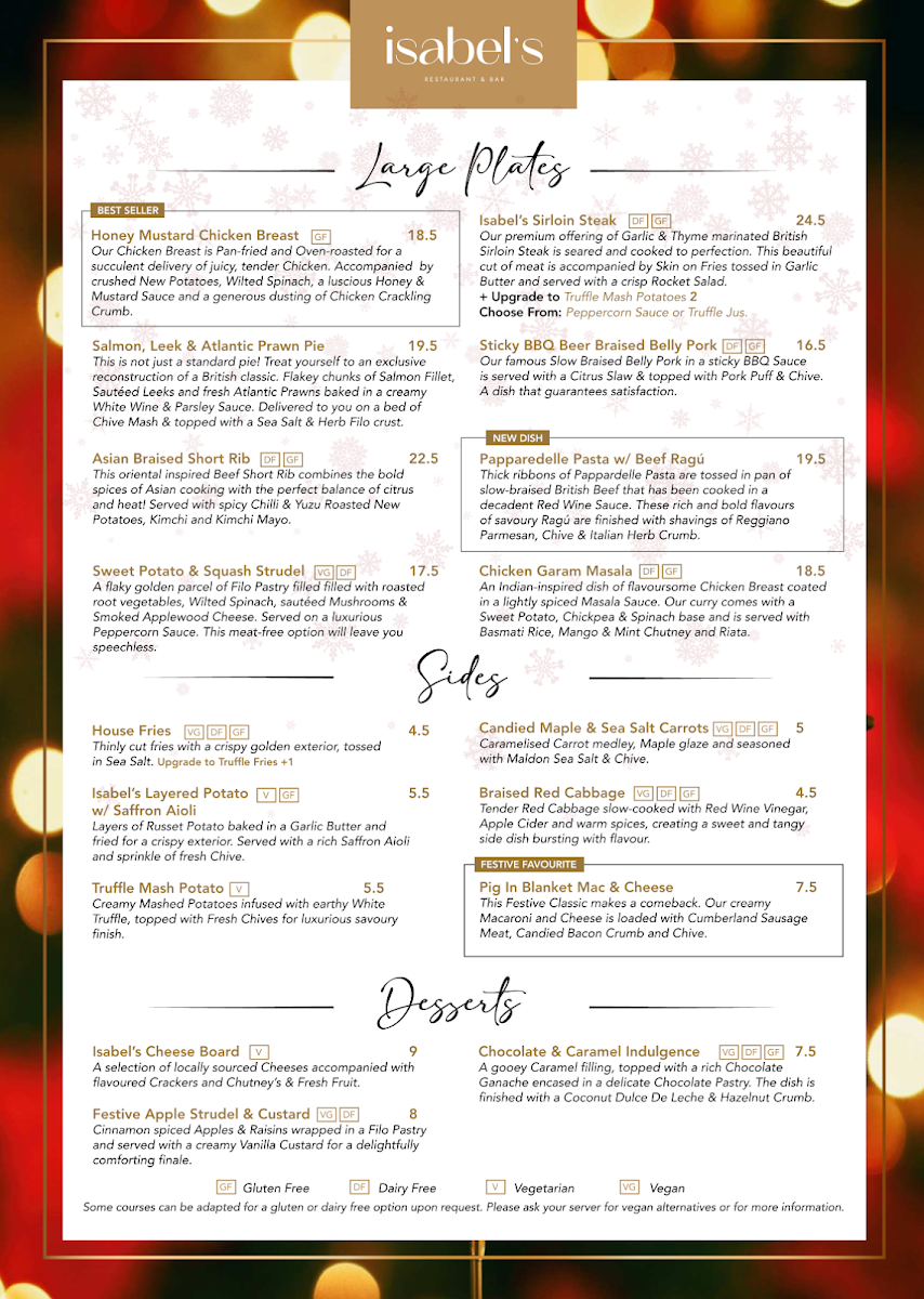 The menu at Isabel’s features a wonderful mix of British and international flavors, showcasing high-quality, locally sourced ingredients. Signature dishes like their grilled steaks and fresh seafood options stand out for their flavor and finesse. The hearty mains, such as the indulgent fish and chips or the tender slow-cooked lamb, are perfect for a satisfying meal. The restaurant also offers a great selection of vegetarian and vegan options, ensuring that all guests can find something to enjoy.
